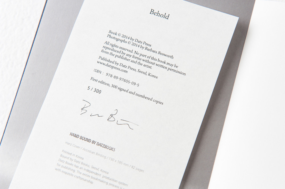 미국의 동부 콩코드에 거주하는 작가 바바라 보스워스에게 사진은 자연과 생을 사랑하는 방법이며 살아있음의 확인이다. 『Behold』에는 작가가 창을 통해 관찰한 새들과 나무, 하늘과 땅이 고요히 존재한다. 새의 날개짓은 돌아가신 부모님의 영혼을 닮아있고, 밤하늘의 별빛은 우주의 비밀을 품고 있다. 시공을 초월한 세계를 연결하는 이 책은 섬세한 수공의 화첩형식으로 제작되었다.