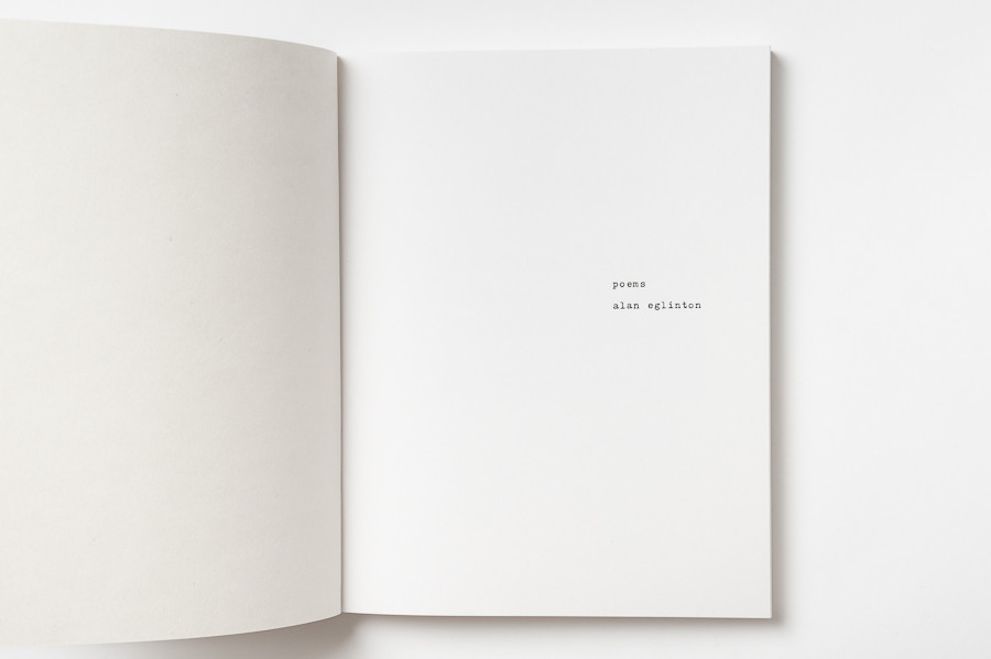 『poems』은 사진과 짧은 시를 이용하여 확장된 방식의 이미지 만들기를 보여주는 책이다. 작가는 카메라를 잠시 뒤로하고, 때때로 펜이나 타자기를 사용하여 매일 관찰한 일상과 삶의 경험을 유머러스하게 들려준다. 마치 여행에서 돌아오면 집이 새롭게 보이듯, 이미지와 텍스트의 조합하여 이미지 관찰자로서 새로운 사진 언어로 확장한다. 짧은 시가 적힌 종이나 오브제는 농담처럼, 일상에 대한 찬미 시처럼, 혹은 삶을 꿰뚫는 잠언처럼 새로운 시선을 일깨운다. 마흔네 개의 짧은 시들과 함께 마흔네 개의 오브제의 이미지가 책에 담겨있으며, 표지는 에글린튼이 책 제목과 이름을 직접 타자기로 쳤던 쪽지를 그대로 사용하였다.