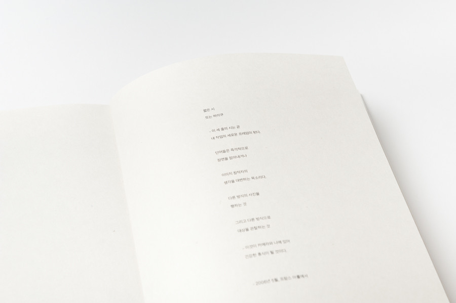 “짧은 시 또는 하이쿠 - 이 세 줄의 시는 곧 내 작업의 새로운 프레임이 된다. 단어들은 즉각적으로 장면을 잡아내거나 이미지 창작자의 생각을 대변하는 목소리다. 다른 방식의 사진을 행하는 것 그리고 다른 방식의 사진을 행하는 것 그리고 다른 방식으로 대상을 관찰하는 것 - 이것이 카메라와 나에 있어 건강한 휴식이 될 것이다.” _알란 에글린튼