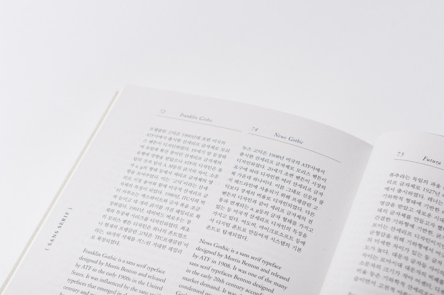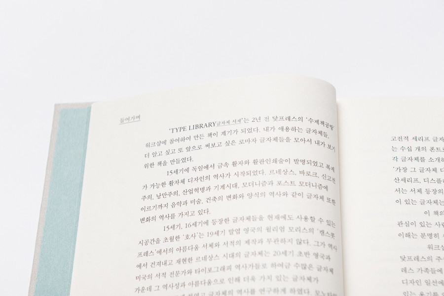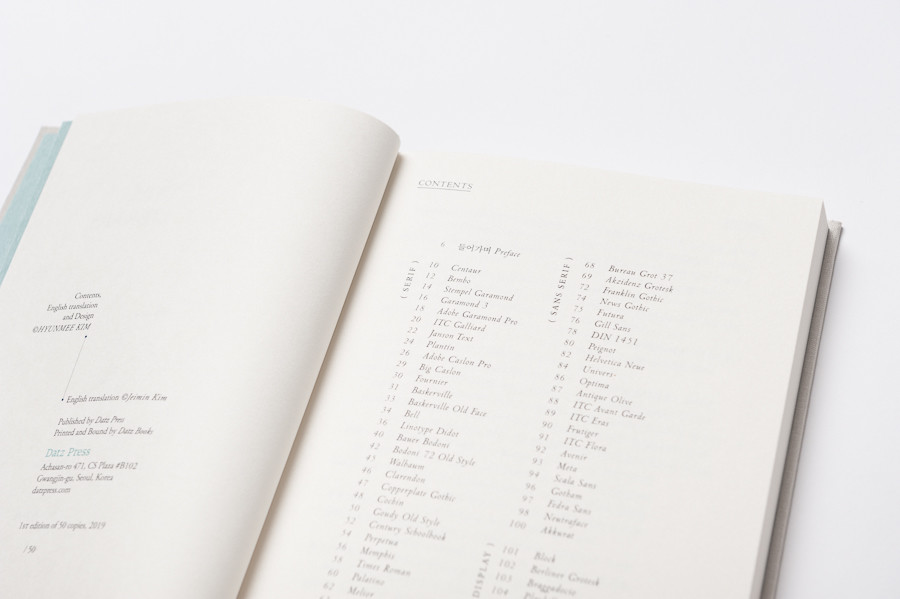 『TYPE LIBRARY』는 타이포그래피 연구자인 김현미 디자이너가 애용하거나 더 연구하고 싶은 로마자 글자체들을 선택하여 모은 자료집이다. 15세기 독일에서 금속 활자와 활판 인쇄술이 발명된 이후 음악과 미술, 건축 양식의 변화 및 역사와 같이하여 글자체의 역사 역시 발전해왔다. 이러한 글자체는 당시의 시공간을 호흡한 개인의 창작물이자 시대와 문화의 산물이기에 타이포그래퍼가 글자체를 선정하여 작업한다는 것은 글자체가 함유한 모든 것을 활용하는 것을 의미한다. 하나의 글자체는 문자 정보의 위계나 구성을 더욱 효과적으로 드러내 주기 위해 대체로 굵기, 기울기, 비례에 있어 변화를 가지는 글자 가족, 패밀리를 이룬다. 이 책에서는 각 글자체를 소개하며 하나의 글자체 패밀리에서 굵기나 비례를 고려하여 ‘가장 그 글자체다운’ 폰트를 선정하고자 하였다. 책의 말미에는 글자체에 대한 역사와 설명의 글을 국영문으로 담았다. 책을 통해 로마체의 서로 다른 모습과 그 이야기에 대한 이해는 새로운 세계에 눈뜨는 경험이 될 것이다. 이 책은 두가지 색상의 표지에 50부 한정 수량으로 제작되었다.
