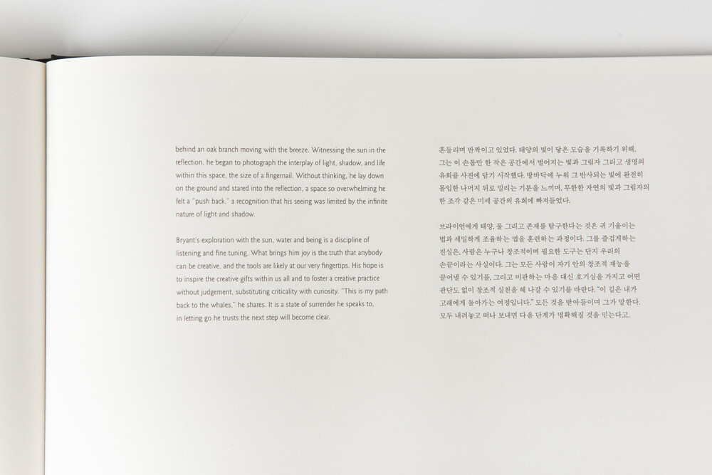 브라이언 오스틴은 20여 년 동안 태양과 물, 영혼의 창이라 할 수 있는 고래의 눈을 사진에 담아왔다. 요세미티 국립 공원에서 태양과 달의 궤적 가운데 무한한 자연의 빛과 그림자를 쫓으며, 오스틴은 자아가 사라지는 현존과 합일을 경험한다. 또한 명료하게 깨어 있는 상태가 되도록 바다 속 숨쉬는 법을 훈련하며, 침묵과 경외, 내려놓음 가운데 고래를 조우하기도 한다. 이렇게 태양, 물, 그리고 존재를 탐구한다는 것은 외부 세계와 연결된 내면의 세계에 귀 기울이는 법과 세밀하게 조율하는 법을 훈련하는 과정이다. 이 책을 통해 빛과 그림자, 그리고 존재들은 하나로 합일되어 광할한 우주에 깊고 단단하게 연결됨을 발견하게 된다.