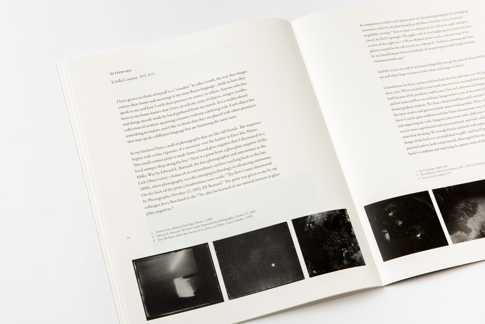 사진가 린다 코너는 인류의 원형적 삶이 남아있는 이국땅의 영적 장소를 탐험하며, 현재의 시간을 거슬러 과거의 삶과 연결된 지점을 찾아간다. 오래된 인류 문명이 담긴 암각화와 밤하늘의 별자리, 숭고한 자연의 풍경이 함께 어우러진 이 땅에서 시간을 초월한 이미지의 언어가 서로 연결되었음을 발견한다. 보이지 않는 저 세계의 문 앞에서 수집된 빛의 그림들은 마치 별자리처럼 이어져 있는데, 이는 하늘과 땅, 성(聖)과 속(俗), 시공을 초월한 인간과 우주, 신과 미지의 영역에 대한 수많은 질문을 던지고 있다. 이 책에는 릭 천문대와의 협업을 통해 나온 유리판 이미지와 초기의 콜라주 작품, 소프트 포커스 이미지 등 린다 코너의 50년의 넓은 작업 세계를 이해할 수 있는 주요 작품들이 포함되어 있다.