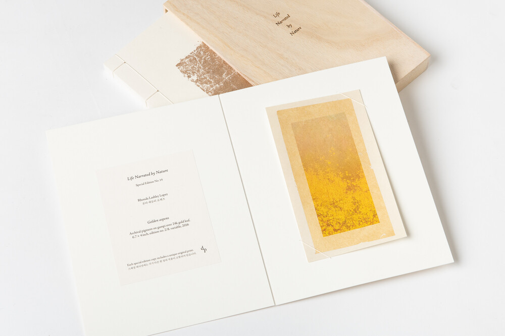 작가는 열린 초원과 시냇물을 따라, 나무와 새들과 곤충들을 카메라에 담는다. 바람 소리, 때로는 고요한 침묵, 흙과 바위와 바다, 초록의 이야기에 귀를 기울인다. 이 사진들은 모든 낮과 밤, 우리를 둘러싼 자연이 주는 특별한 아름다움과 신비에 경외감을 표하는 작가의 마음이 담긴 시와 같다. 작가는 특별한 프린트 공정을 통해 작품을 완성하는데, 마음의 눈으로 깊이 공명한 자연의 순간을 금을 입히거나 사진 화학적인 고유한 과정을 거쳐 종이 위에 담아낸다. 연금술과도 같은 섬세한 인화 과정은 작가가 품은 자연의 빛이 물질로 전이된 결과다. 이와 같은 작업의 과정을 책으로 전환하기 위해 표지에는 실크스크린, 수제작된 나무 케이스, 전통 제본 방식 등의 섬세한 제작 공정을 거쳐 오리지널 프린트가 포함된 100권의 리미티드 에디션과 추가로 작품이 한점 포함된 20권의 스페셜 에디션으로 구성되었다.