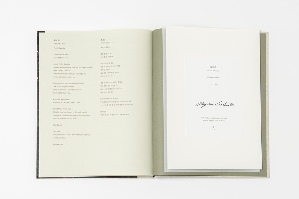 이 책「소도SODO」는 ‘폭포’라는 뜻의 프랑스어에서 가져온 지명 ‘소도Sodo’에서 그 이름을 따왔다. 1849년 폭포에서 나타난 성모 마리아를 기념하는 장소에서 시작된 순례는 ‘부두Vodou’라는 지역 종교와 합하여져 새로운 영적 의미로 태어났다. 죄사함을 원하는 자, 감사하고자 하는 자, 깨달음을 바라는 자들 모두 이 영적 장소에 모여 신성한 폭포에 몸을 담그고 깨끗해지기를 소망한다. 필리스 갈렘보는 1997년부터 2001년까지 아이티의 성지 소도에서 이루어진 영적 의식을 촬영해왔다. 작가는 이전에 그들의 전통 의상을 촬영하기 위해 사용했던 무겁고 불편한 전문 장비대신 흑백 필름을 장착한 수중 카메라를 들고 그들과 함께 폭포에 들어갔다. 용서와 축복이 일어나는 이 장소에서 신실한 사람들이 신을 쫒듯, 영과 혼이 스스로 드러나길 기대하며 카메라 셔터를 눌렀다. 그리고 기뻐하며 떠나는 사람들처럼, 마침내 작가는 신비스럽고 마법같은 순간들이 담겨진 것을 보게 되었다.
