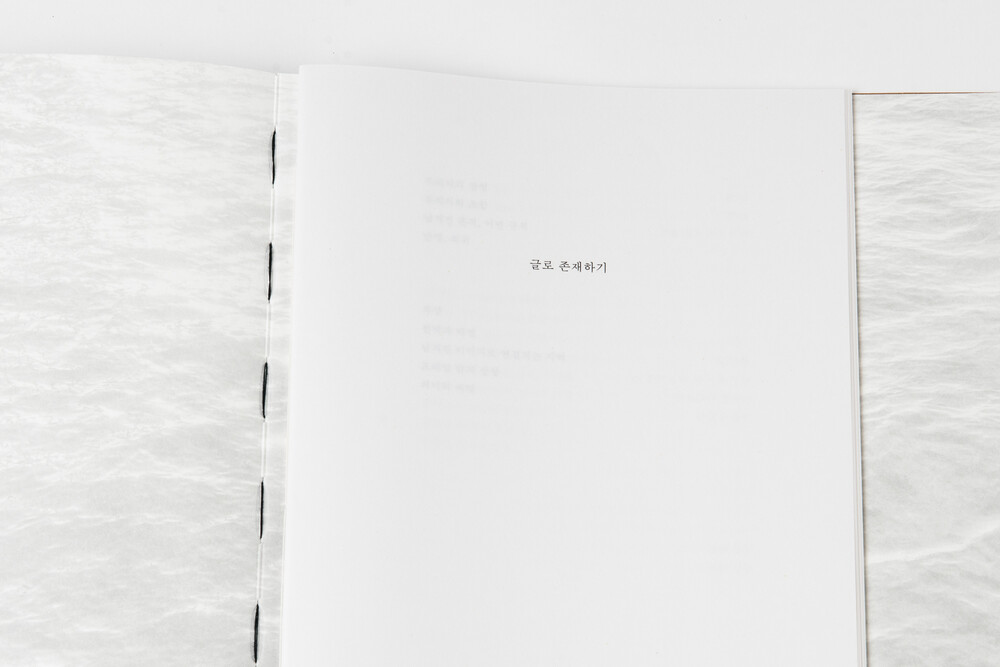 작가에게 사진은 대상을 바라보고 인식하는 사고의 과정을 위한 도구다. 외부의 대상들은 작가의 감각과 인식이 반영된 내면의 풍경이 되고 사고의 흐름과 연상 작용을 따라 재구성된다. 작가는 땅과 하늘, 호수, 나무 등의 자연을 바라보는 것을 통해 자연의 일부인 자신을 다시 만나는 다양한 관점을 연습한다. 시력을 잃을 뻔한 사건을 통해 본다는 것에 대해 새롭게 인식하게 된 작가는, 자신의 X-ray 사진의 혈관들을 나뭇가지와 연결하거나, 빛이 투영된 다른 대상들과 연결하며 안과 밖의 풍경을 교차시킨다. 10여 년 동안 수집된 구체적인 장소와 대상은 기억 속에서 서로 조우하며 빛의 추상이 되어 남는다. 작가는 촬영한 사진들을 선택하고 재구성하여 책으로 편집하는 과정을 창작의 다른 방법으로 적용하고 있다. 자전적인 이야기가 담긴 텍스트 북을 통해서 삶과 사진 매체에 대한 작가의 믿음과 태도를 접할 수 있다. 이 책은 180장의 사진이 연결되어 흐르는 이미지 북이 국영문의 작가 노트를 품고 있는 형식으로 구성되었다.