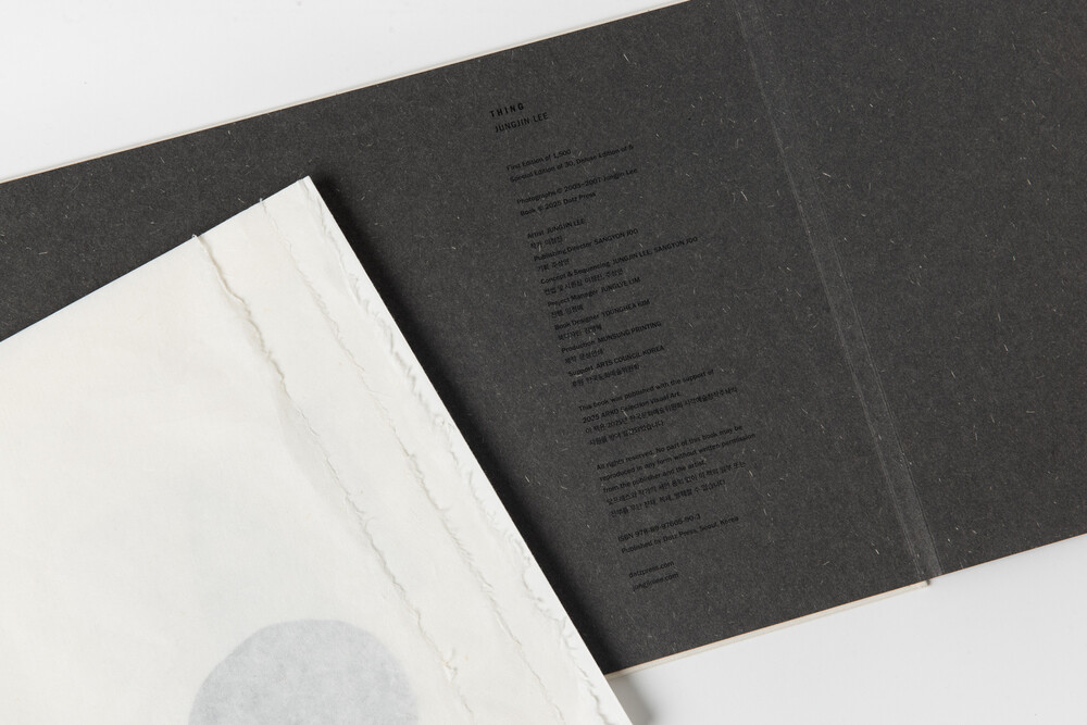 이정진 작가의 ‘Thing’ 연작은 일상 사물을 확대 촬영한 사진을 직접 제작한 한지에 흑백으로 프린트한 작품이다. 작가는 명상적 촬영 과정을 통해 대상의 본질만을 남기고 모든 부수적인 요소를 비워간다. 배경과 그림자도 제거되며 형태는 단순화되는 대신 자신의 감정과 깊은 내면의 메시지가 빈 공간을 채우고 있다. 특히, 먹빛 사물 주변의 흰 여백은 동양화나 서예의 ‘비움’의 미학을 반영하며, 이 비움을 통해 사물은 새로운 의미를 얻는 것이다. 작가는 바라봄을 통해 본질을 찾아가는 과정과 존재를 탐구하고 표현하는 예술적 역할에 대한 질문을 던지고 있다.‘Thing’ 시리즈는 풍경 위주의 작업을 보여주는 작가의 작품세계에서 독특하고 고유한 위치를 차지하고 있다. 시간이 흘러도 변하지 않는 작업의 생명력이 20년이 지난 지금 한지와 수제 전통 제본을 통해 기품 있는 오브제로 탄생했다. 작가의 더미북이 닻과의 협업을 통해 한국적 재료와 물성을 지닌 ‘Thing’이 된 이 책은, 그 자체가 아름다운 존재감을 지닌 아티스트북이다.