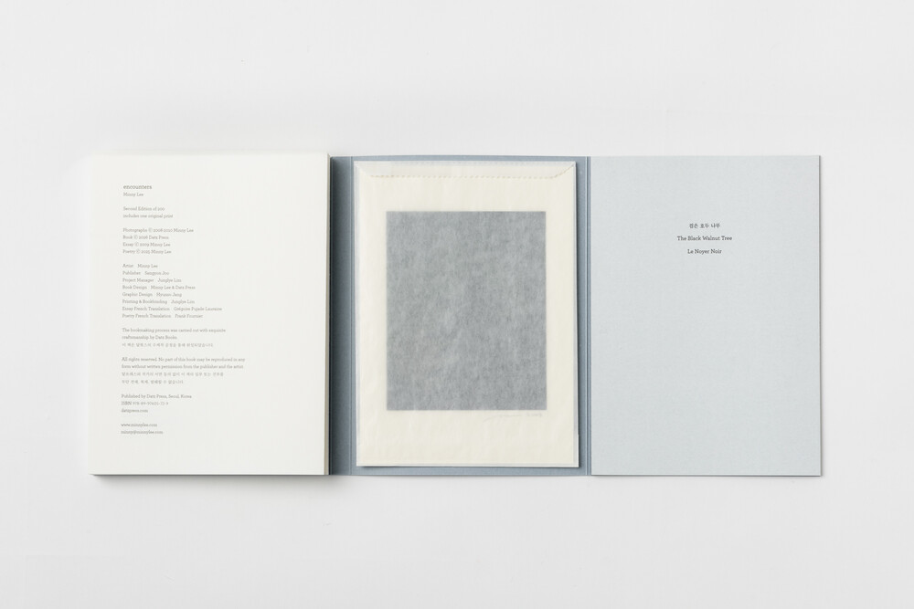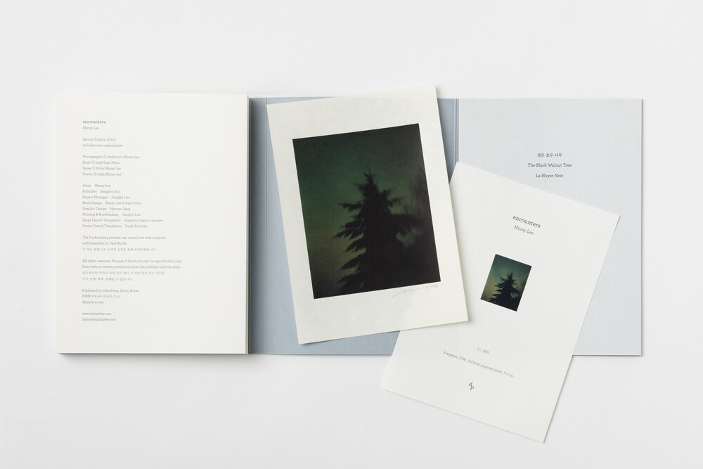 『encounters』는 작가가 일상 속에서 마주한 나무들의 초상을 담은 사진집이다. 이 두 번째 에디션은 200부 한정 수제작되었으며, 첫 번째 에디션에 있던 비평글을 덜어내고 그 자리에 작가가 직접 쓴 시를 더했다. 책은 사진, 에세이, 그리고 시로 이어지며 우리를 내밀한 감정으로 안내한다. 각 권에는 작가가 직접 프린트한 작품 한 점이 수록되어 있다.