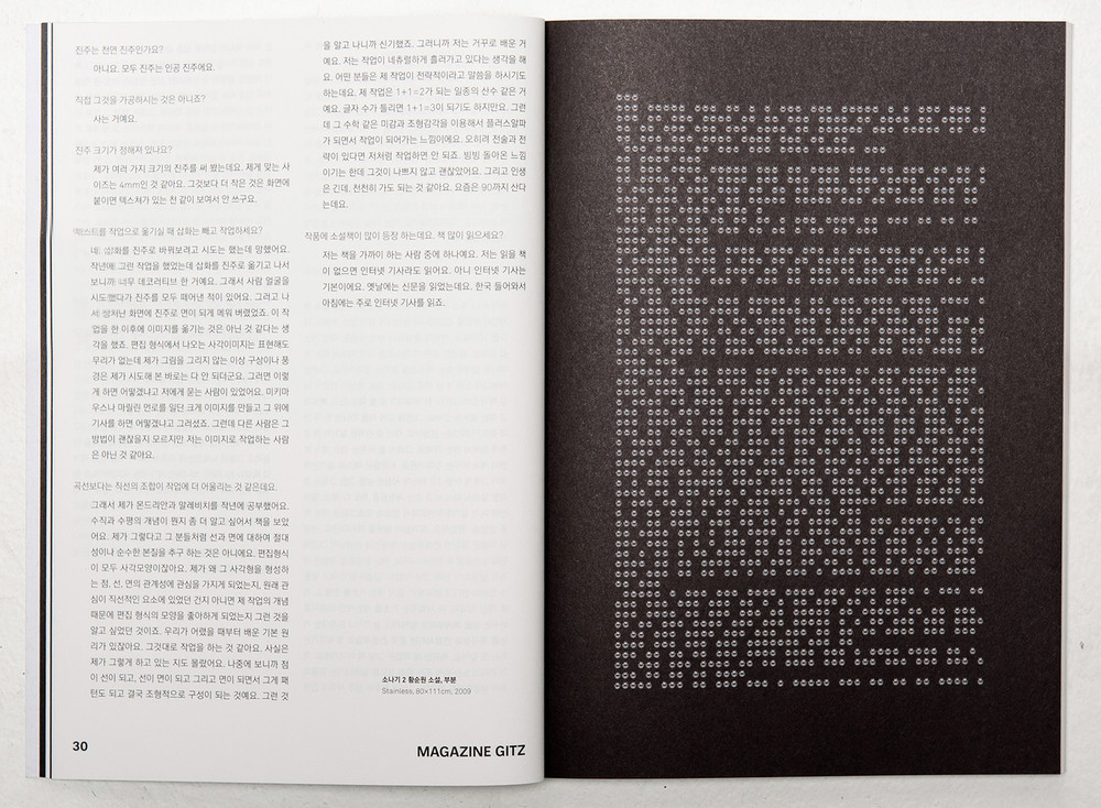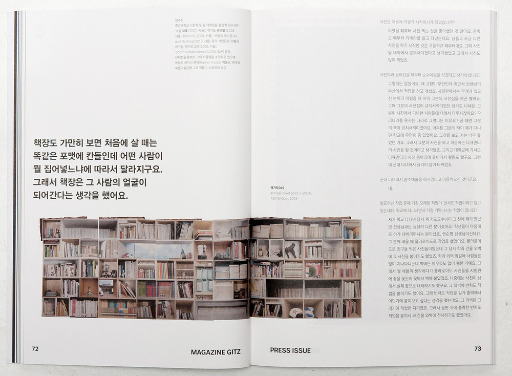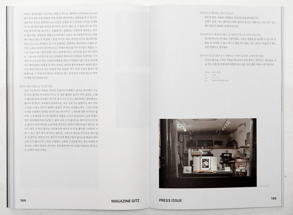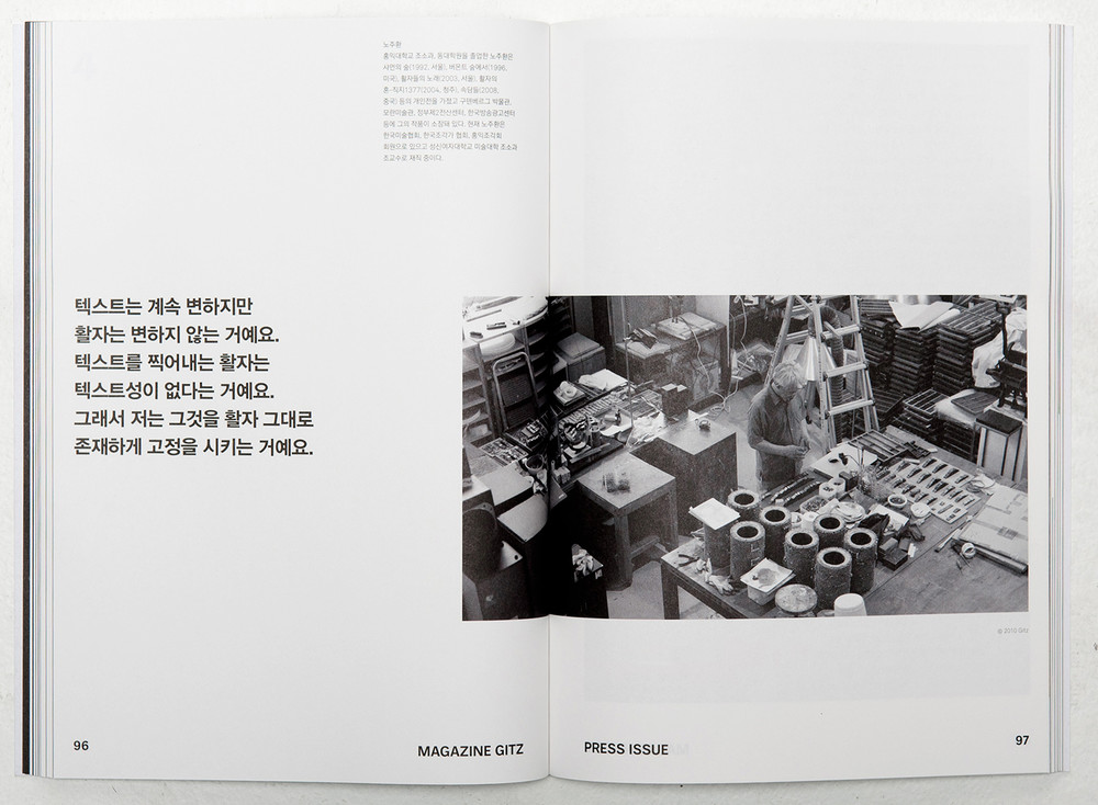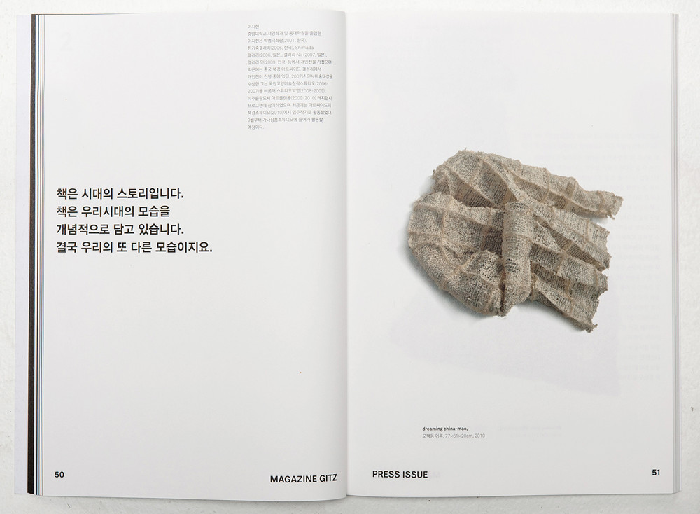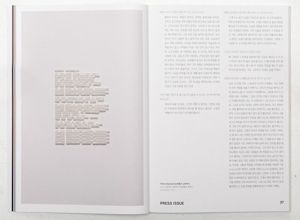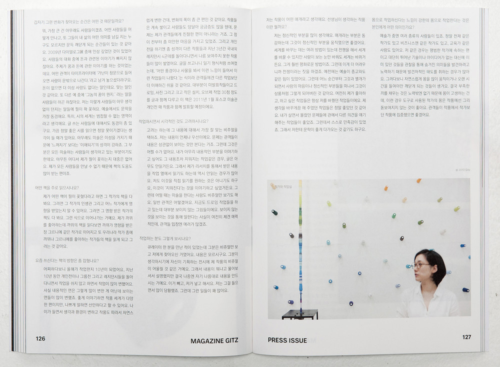 매거진 깃 1호는 매거진 깃의 창간호로서 ‘Press’라는 주제 아래 텍스트와 서사, 책과 인쇄, 출판에 영감을 받아 작업하는 여덟명의 작업세계와 그들의 인터뷰를 소개한다. 시각예술가 고산금은 신문 혹은 책에 실린 문장들을 시각적 형태로 해석하기도 하고, 이지현은 집요한 노동을 통해 책의 고유의 형태를 설치로 작동시켜 보여주기도 한다. 임수식은 초상사진과도 같은 개인의 서재를 책가도로 표현하고, 노주환은 ‘읽다’라는 기능이 소멸된 활자를 도구로 삼고 있다. 박혜수는 텍스트와 서사를 이용해 일종의 ‘환기’를 불러 일으키며 작업한다. 작품을 담는 포트폴리오를 제작해주는 팀 ‘포트폴리오’와 북디자이너들이 모인 창조적 공동체 ‘스튜디오헤르쯔’, 닻프레스의 출판물과 깊이 연계하여 지속적으로 전시를 기획하는 닻미술관도 소개한다.