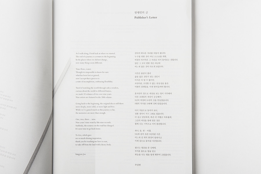 지난 9년간 깃은 작가의 삶이 깃들어 있는 소통의 도구로써 창조적 영감을 구현하기 위해 발간되었다. 10호에서는 예술 안에서 이제까지 깃을 통해 추구하고자 했던 과정과 태도를 다시 돌아본다. 류텐 폴 로젠블럼, 앨리사 후지타 가루이, 아만다 마찬드는 명상적인 태도로 마주한 시공간을 자신만의 언어로 응축하여 정화한다. 김미경, 핸드릭 폴과 브라이언 오스틴은 자연의 무한한 모습을 탐구하듯 렌즈에 담아내며, 우리의 존재 의미를 고찰하게 한다. 훈리는 감각적이고 예술적 언어로 도시를 탐구하며, 미니 리는 지구의 모습을 통해 드넓은 우주 가운데 존재하는 인간과 태고의 시간을 상상하도록 이끈다. 메리 다니엘 홉슨은 내면으로의 깊고 명상적인 여행을 통해 성장과 치유의 이야기를 나눈다.