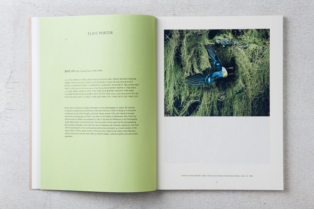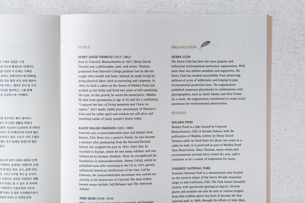 매거진 깃 8호에서는 사상가이자 철학자, 시인인 헨리 데이비드 소로우의 삶과 그의 책 ‘월든’으로부터 영감 받은 예술가들의 창작세계가 소개된다. ‘월든’의 글과 자신의 사진을 묶어 사진집을 출판하기도 했던 엘리엇 포터는 생태학자이자 자연사진의 거장이다. 오랜 시간 동안 초월적 영감을 선사하는 그의 사진을 소개하며, 월든 호수에서 영감을 받은 주상연의 사진과 이를 퍼포먼스와 에세이로 재해석한 미니 리의 작업세계를 풀어낸다. 데이비드 엘링슨은 선조들에 의해 잘린 후 남은 나무 그루터기들의 초상을 기록하여 자연이 주는 교감과 인간의 욕망을 대치시킨다. 칼튼 와킨스는 서부의 낙원이라 불리는 요세미티를 기록하였으며, 와킨스의 후학인 사진가 커크와 그레첸은 사진으로 기록된 자연의 신성한 아름다움과 상반된 인간의 욕망을 보여준다.
